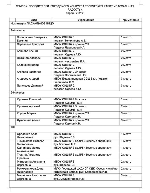 С 9 по 15 апреля в Озёрах проходил конкурс творческих работ «Пасхальная радость». В нём приняли участие дети и взрослые. Из 96 представленных работ призёрами стали 46 человек. Все работы будут представлены на благотворительной ярмарке «Все вместе!», которая состоится 19 апреля возле Троицкого храма г. Озёры. Выражаем благодарность всем участникам!