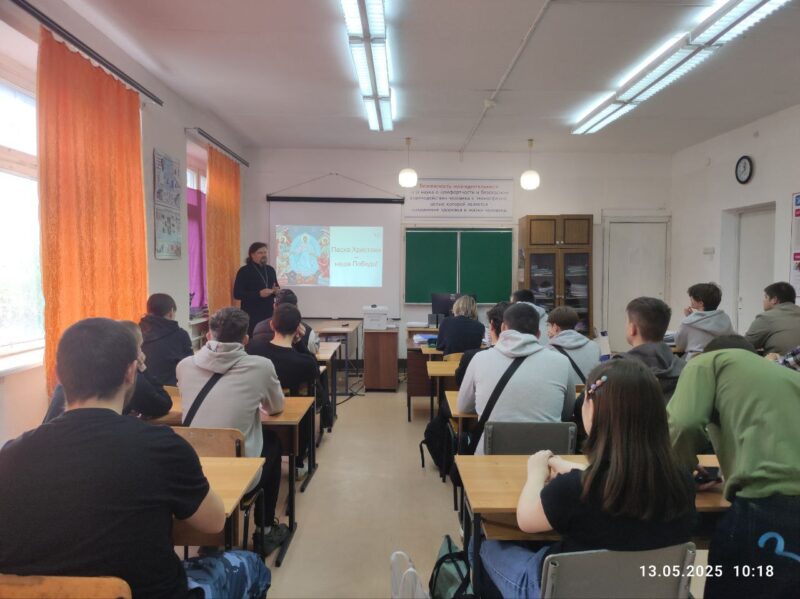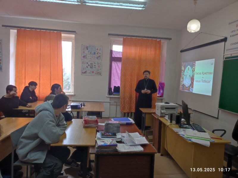 13 мая в филиале Егорьевского экономического техникума состоялась встреча со священнослужителем. Клирик Троицкого храма иерей Артема Карабанов рассказал студентам о Пасхе. Мероприятие прошло в рамках миссионерской акции. #Пасха2025_СМО_Коломенская_епархия.