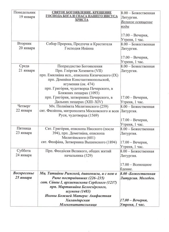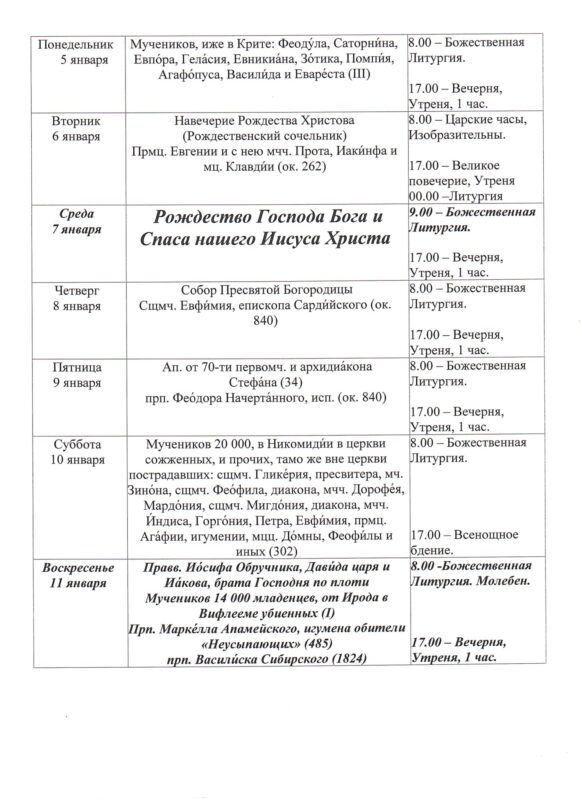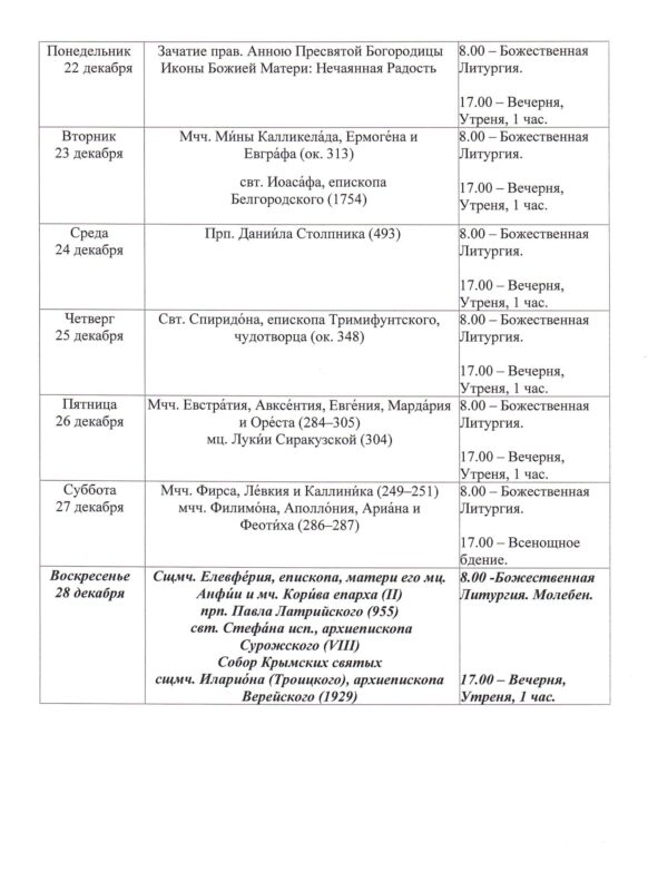 Храм открыт ежедневно с 7.30 до 19.308.00 — Божественная Литургия17.00 — Вечернее богослужениеИсповедь осуществляется перед началом Божественной Литургии, а также по окончании вечернего богослужения накануне воскресных и праздничных дней. ~ ~ ~ Подробное расписание находится на дверях храма |