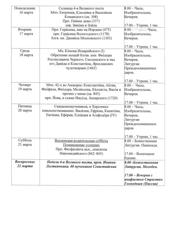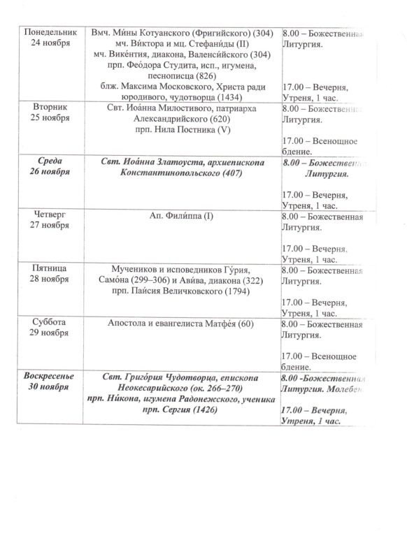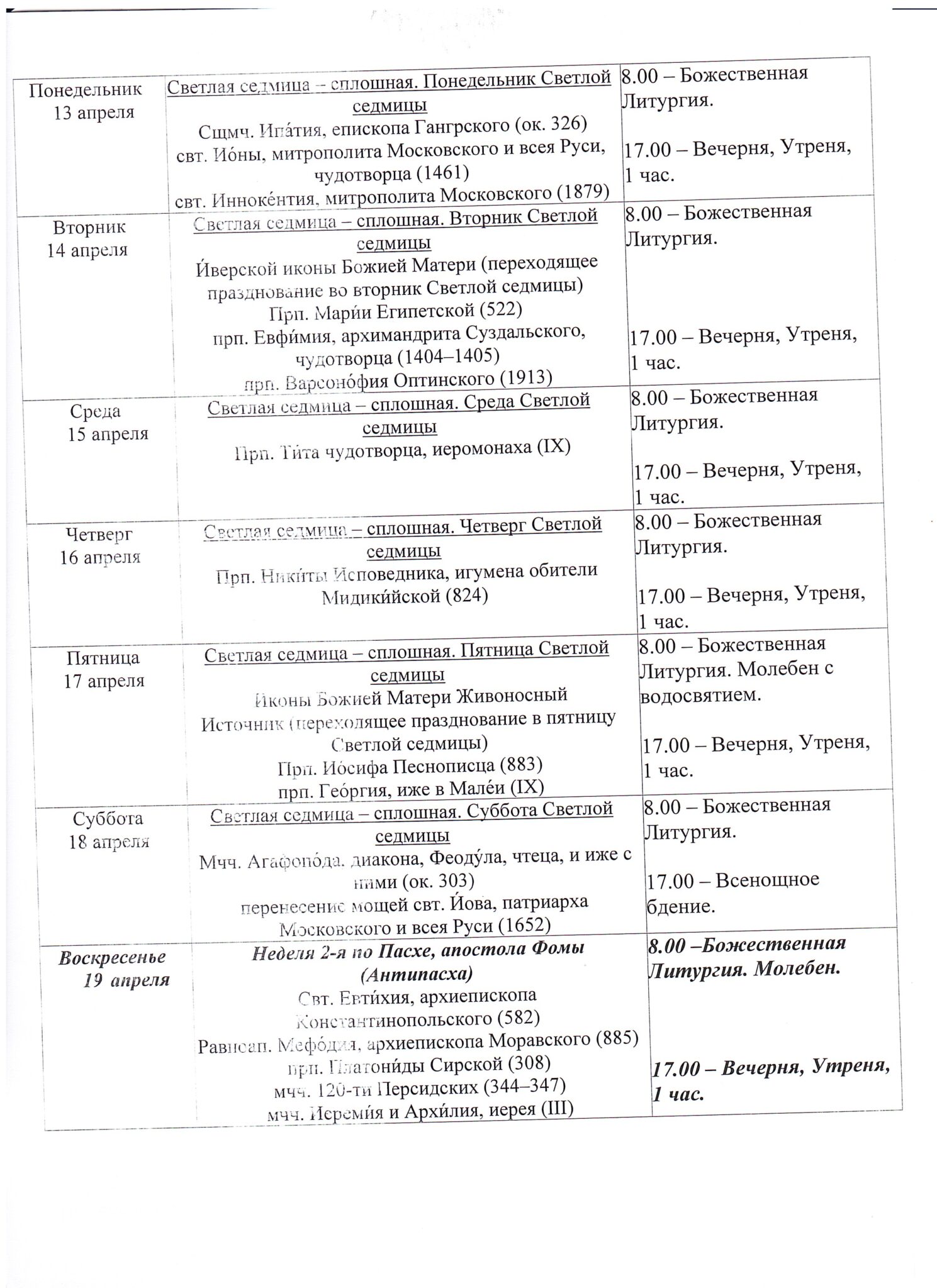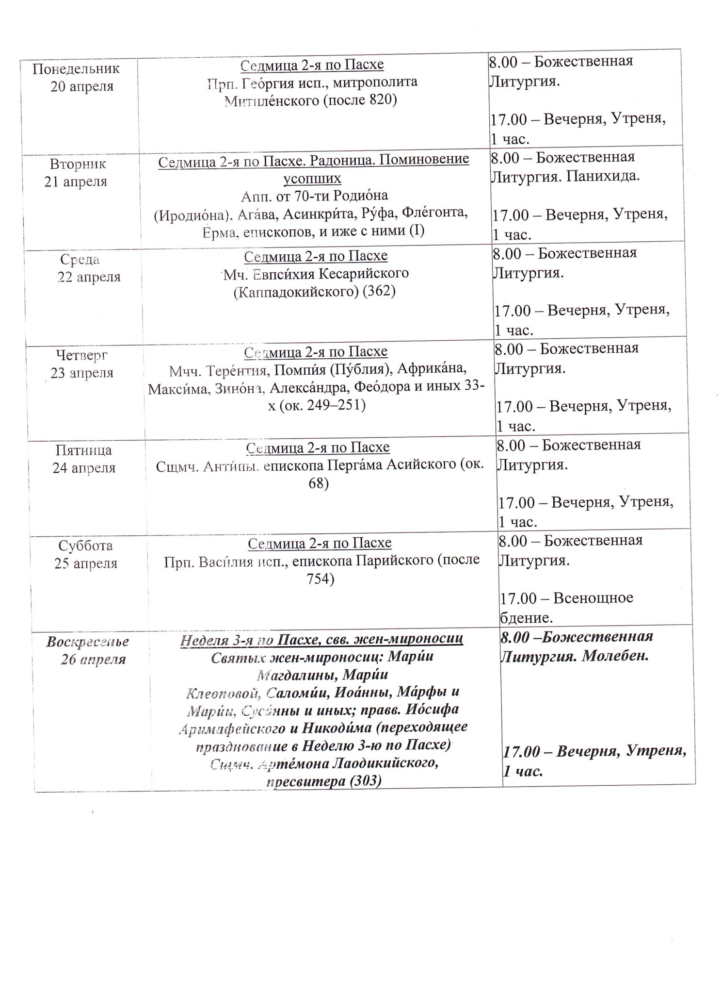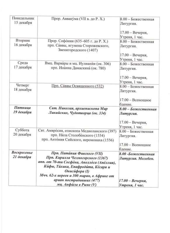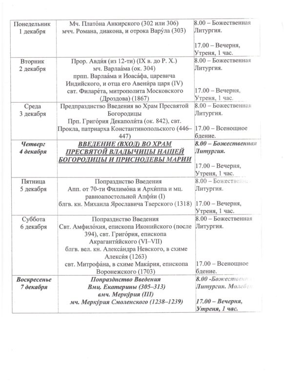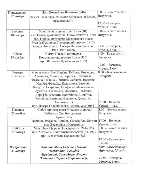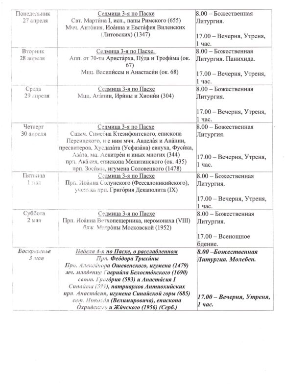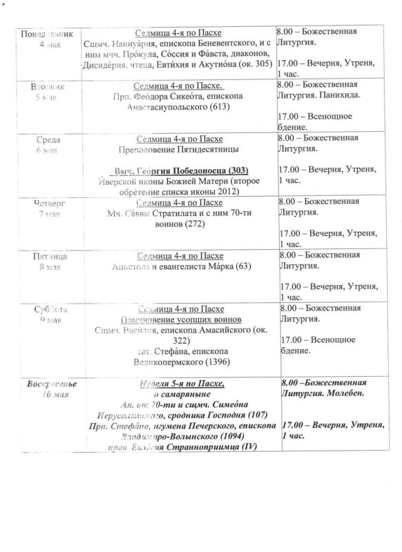 Храм открыт ежедневно с 7.30 до 19.308.00 — Божественная Литургия17.00 — Вечернее богослужениеИсповедь осуществляется перед началом Божественной Литургии, а также по окончании вечернего богослужения накануне воскресных и праздничных дней. ~ ~ ~ Подробное расписание находится на дверях храма |
