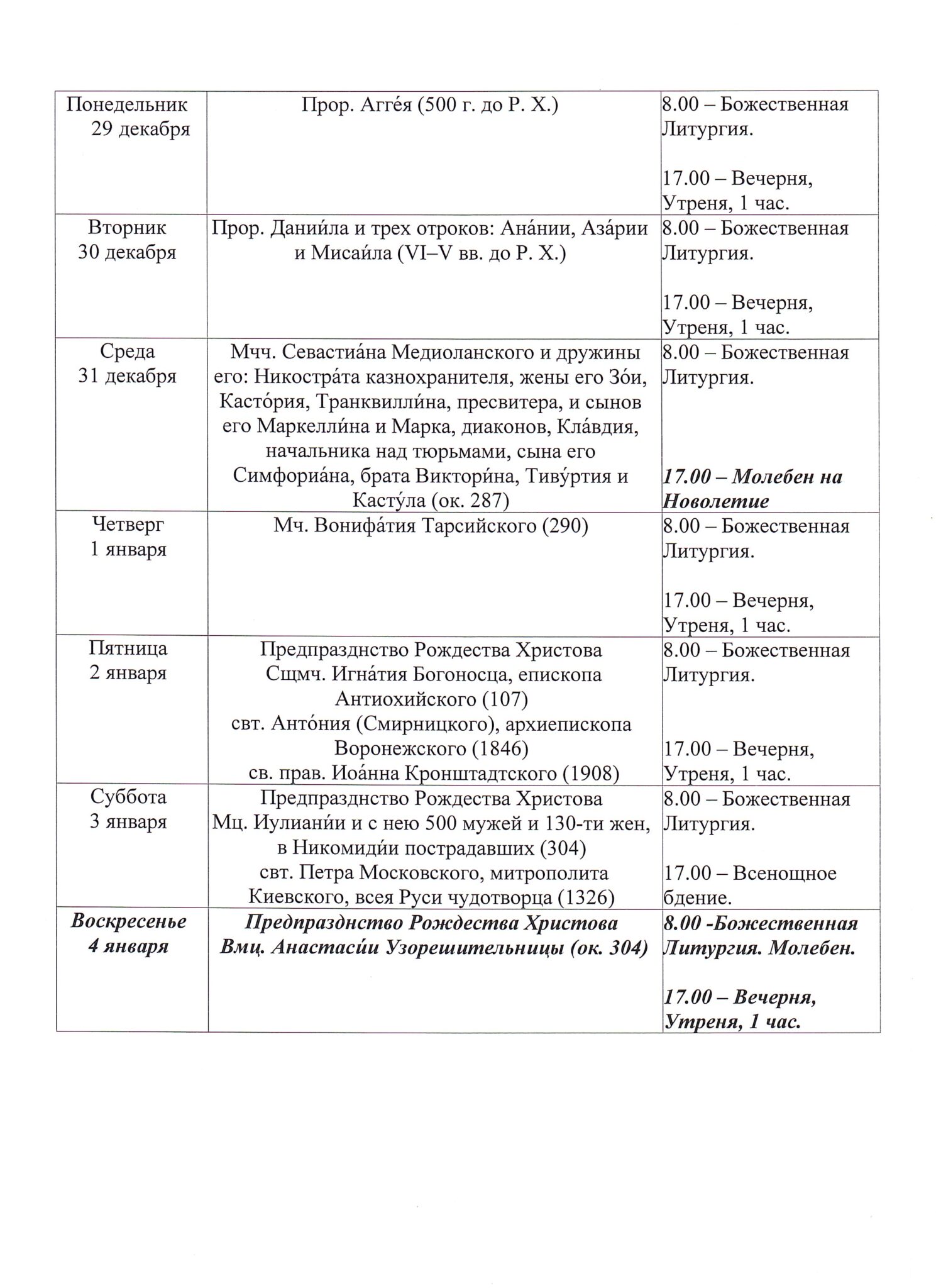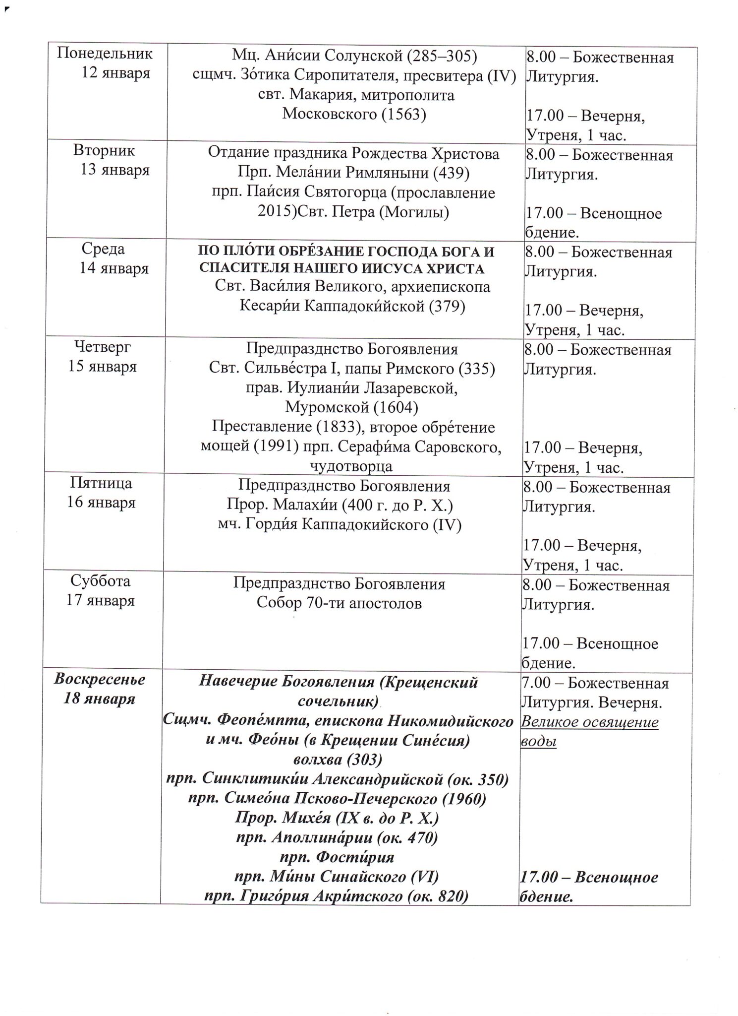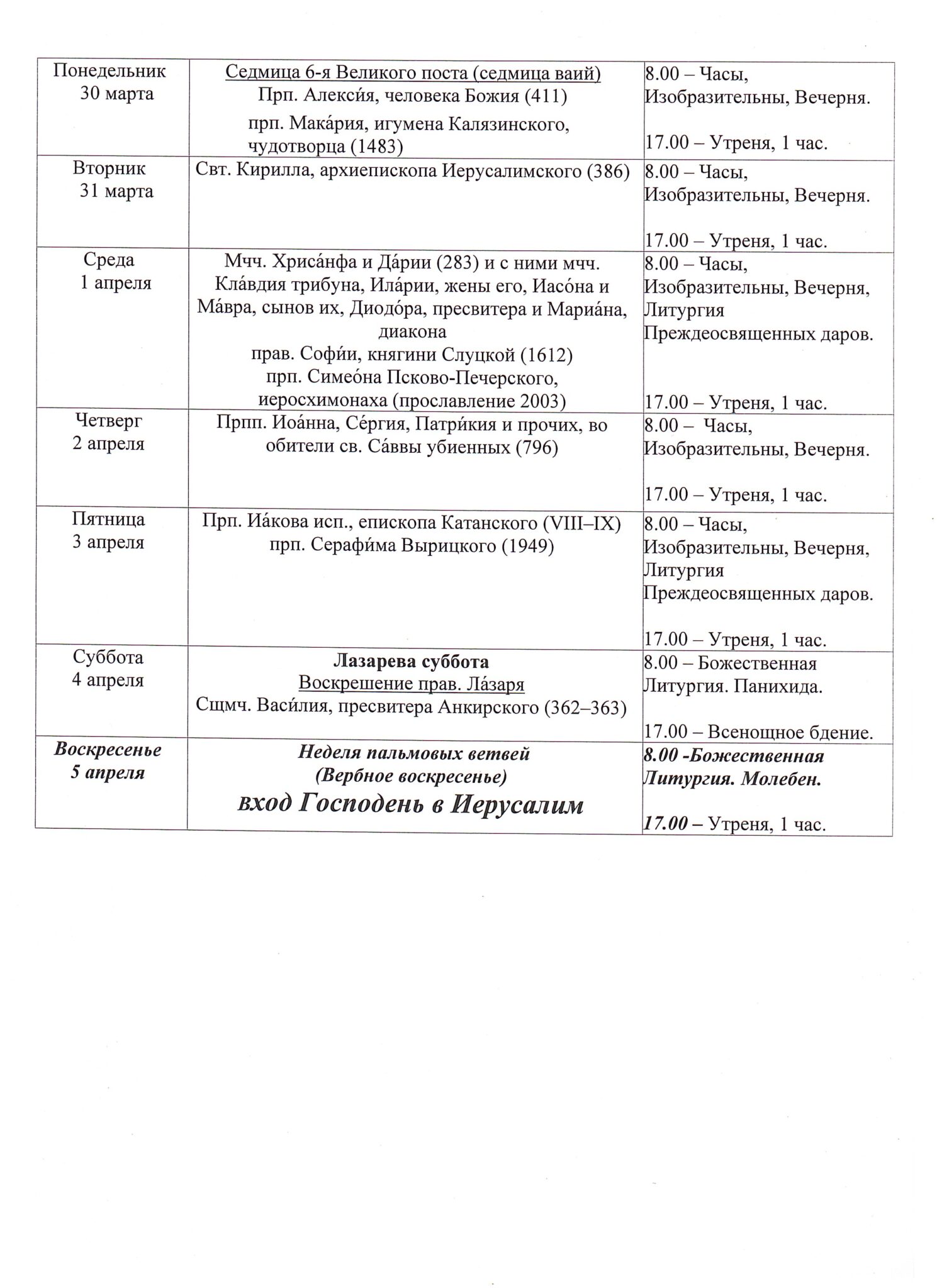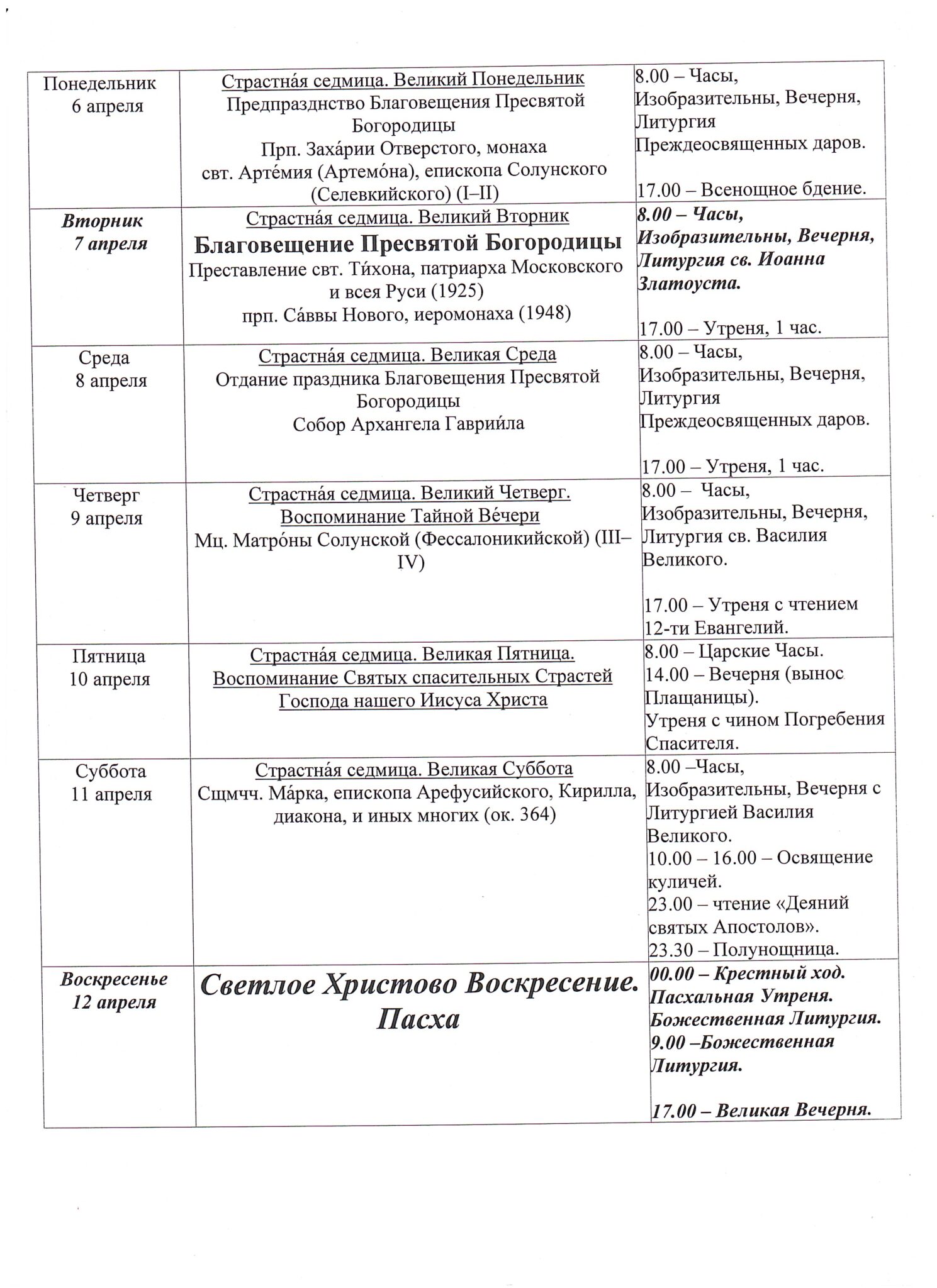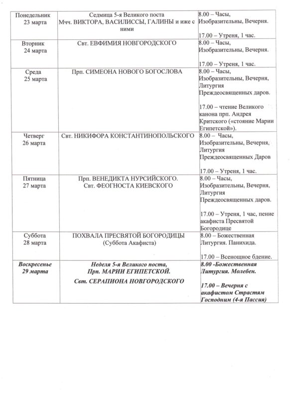 Храм открыт ежедневно с 7.30 до 19.308.00 — Божественная Литургия17.00 — Вечернее богослужениеИсповедь осуществляется перед началом Божественной Литургии, а также по окончании вечернего богослужения накануне воскресных и праздничных дней. ~ ~ ~ Подробное расписание находится на дверях храма |
